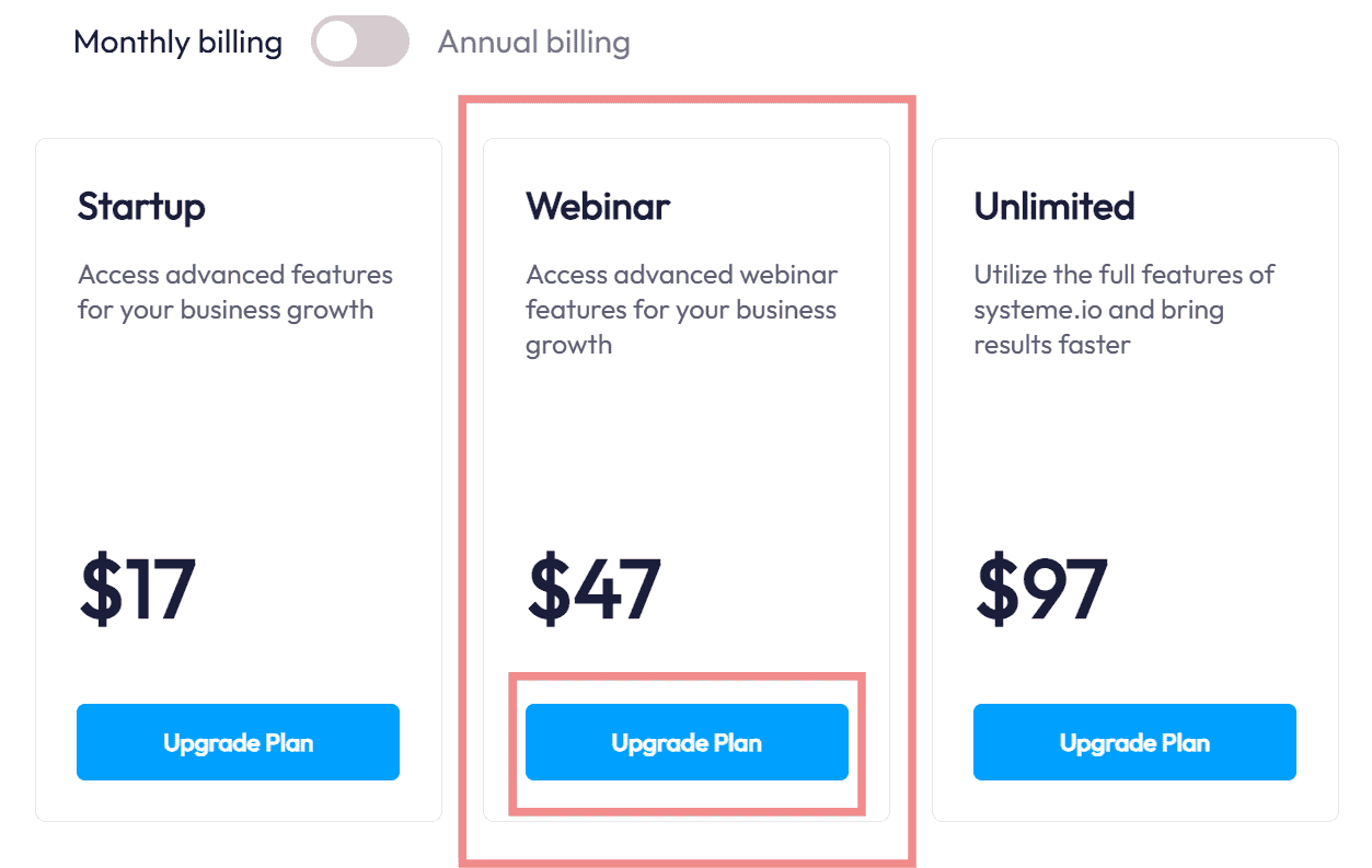 Upgrading to the Systeme.io Webinar Plan follows a straightforward process: